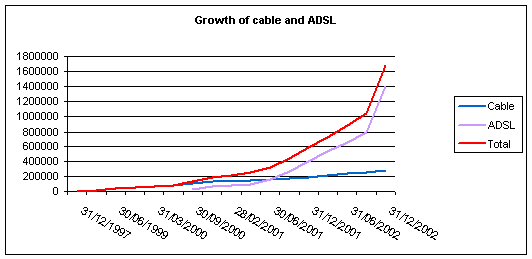 The year 2002 was marked by the strong development of high speed, and ADSL in particular, with the number of high-speed subscribers multiplying by 2.5 in just one year, growing from 600 000 at end 2001 to close to 1.7 million at end 2002 High-speed subscribers now represent about 16% of active subscribers to Internet access. These figures have been strongly affected by the growth of ADSL, as shown in the graph below.