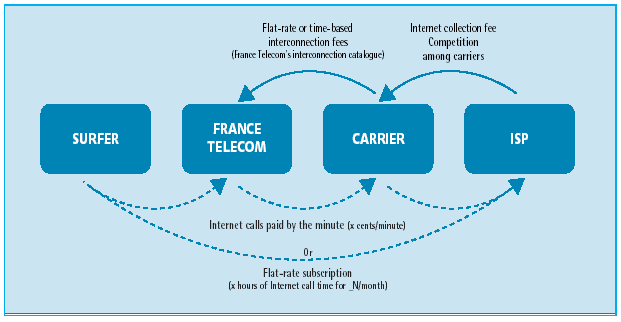 France Telecom’s network telephone connects 34 million subscribers. Interconnection and unbundling allow third-party operators to deliver telephone subscriber traffic (interconnection), or even obtain complete control over the line connecting the subscriber (unbundling of the copper pair). The purpose of ART’s decisions and opinions has been to facilitate the development of competition among both carriers (or collection operators) and ISPs. Competition among carriers seems particularly important in that it allows competing ISPs to develop without necessarily depending on a single carrier (France Telecom). This approach is consistent with the mindset which has predominated until now in opening the telecoms sector to competition in France: competition through infrastructures in order to extend the lifespan of competition among service providers. 4.2.1 Low-speed Internet: currently used by 80% of surfersART pays special attention to dial-up Internet access, called low-speed Internet, because it is still used by around 85% of surfers. Several of ART’s decisions and opinions have marked and facilitated the emergence of competition for Internet traffic collection. Background Initially, dial-up Internet access used geographic numbers, i.e. classic telephone numbers beginning with 01, 02, 03, 04 or 05. At the time, Internet access traffic was not distinguished from classic telephone traffic in any way. The price of calls to these numbers was the same as a classic local call. Surfers paid their subscription to the ISP and their Internet telephone calls to France Telecom separately. In late 1997, in order to meet the needs of a market which wanted to identify traffic to ISP servers in order to introduce specific pricing options for Internet calls and route them differently in the phone networks, ART assigned blocks of numbers to Internet access services, having the form 0860 PQ MCDU. At the same time, it oversaw the implementation of an interconnection model between France Telecom and alternative operators, allowing these operators to propose collection offers to ISPs. Thus, at ART’s request and following several dispute rulings, France Telecom included in its interconnection catalogue for 2000, a specific interconnection offer for Internet access traffic providing operators and ISPs with better control over the technical and economic parameters of their offers.
