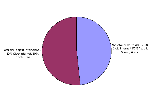 Du point de vue de leur politique d’achat, il convient de distinguer : - les FAI appartenant à un groupe disposant par ailleurs d’un réseau et ayant recours en totalité à des prestations internes de collecte de trafic : - Wanadoo (3 millions d’abonnés actifs) fait appel de manière exclusive à sa maison-mère France Télécom, qui dispose ainsi de fait d’un segment "captif" qui représente une part importante de ce marché ; - Free a également recours à des prestations internes par le biais de Free Télécom ; - les FAI "indépendants" : - avec 1 million d’abonnés actifs fin 2001, AOL génère un volume de trafic aussi important, voire supérieur, à Wanadoo, et représente 66 % du marché "ouvert" (hors Wanadoo). La forte consommation des abonnés d’AOL peut notamment provenir des abonnés "illimités" inscrits entre octobre 2000 et mai 2001. Quoiqu’il en soit, AOL dispose ainsi d’une position très forte de négociation vis à vis des "collecteurs" ; elle n’a pas d’accord d’exclusivité avec un opérateur de réseau en particulier ; - les FAI qui bien qu’appartenant à un groupe disposant par ailleurs d’un réseau, ne confient pas tout leur trafic au réseau de leur groupe : - Club-Internet ne dispose pas d’accord d’exclusivité avec Siris : elle est ainsi libre de confier son trafic au collecteur de son choix, même si à prestations et tarifs équivalents, elle fait appelle au groupe (clause de préférence) ; - la moitié du trafic de Tiscali est collectée en interne sur le réseau de A Télécom (groupe Tiscali), l’autre moitié est collectée par d'autres opérateurs. Au total, pour un opérateur indépendant des FAI, 52 % du marché est considéré comme fermé car captif d’un groupe intégrant les activités de FAI et de collecteur : le marché "non captif" pourrait même se réduire si Tiscali décide d’augmenter la part de trafic collecté sur son propre réseau :