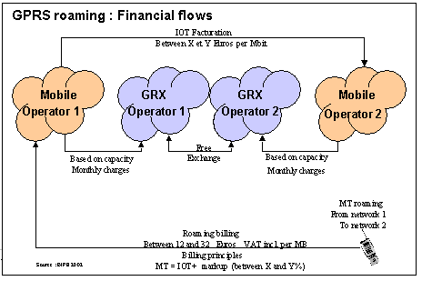 The financial flows are separated according to whether they are flows between GRX operators (currently based on free exchange) or flows between mobile operators (based on the roaming agreements concluded between them and contain at heart amongst other things the IOT(2)). The retail prices for roaming, which at present are still prohibitive, may drop as the service develops. Finally, the financial flows destined for the content providers and aggregators using the GPRS have not yet been perfectly clarified. All these flows between mobile and GRX operators are show in the diagram below: