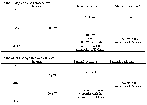 is not suitable for this type of experiments. The radio-electric installations shall use the extended spectrum technology based on the harmonised standard EN 300 328-2 of ETSI or any other standard recognised as equivalent. They shall function on the basis of non-jamming and without guarantee of protection. The effective isotropic radiated power (EIRP) transmitted by any network(3) equipment shall not exceed 10 mW on the entire 2400-2483.5 MHz band, conforming to European decisions. All projects in Metropolitan France shall be studied case by case by the Defence Ministry, so as to prevent a too high concentration of radiated power that may cause significant disturbances of the Defence Ministry equipment. As a result of limitation of power (EIRP), the limit of a network made up only through the RLAN technology shall be typically few hundred metres and shall not exceed a few kilometres in the best case The applicant may use the 2.4 GHz band for establishing a point to point link, provided the transmission of effective isotropic radiated power (EIRP) does not exceed 100 mW. If these conditions cannot be satisfied, he has to apply for an allotment of resources in an ad hoc frequency (a dedicated microwave frequency, for example) or use a wire based technology. The application file for authorisation shall contain technical information (Cf Appendix 1) concerning, in particular, the quality of services. The applications for experimental authorisation shall contain