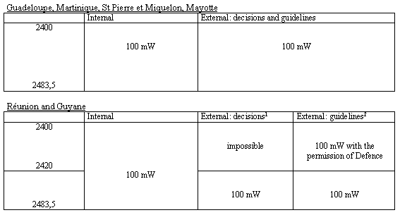 The use of 2.4 GHz and 5 GHz frequency bands is variable in Europe today. A certain number of countries, including France, limit the use of RLAN to private networks while others allow the use of these bands for services open to the public. The approach of the Authority forms part of the move towards the relaxing of the regulations, which is largely underway in Europe, so that France can take full advantage of the growth in this technology. The Authority has therefore notified the European Commission in July 2002 of its decisions projects for extending the present use of RLAN to public services. In France, the concerned frequency bands are managed jointly by the Authority and the Ministry of Defence. This shared control leads to regulatory and technical limitations explained by the necessity of organising the progressive migration of the Defence Ministry equipment using the 2.4 GHz band to other frequency bands in order to allot the frequencies thus freed for civil use, including the RLAN. When the 2.4 GHz band is released, it shall be possible to use an Effective Isotropic Radiated Power (EIRP, thereby including the antenna gain) of 100 mW on the entire band. From 2004, on the entire territory and on the entire band, the effective isotropic radiated power (EIRP) authorised shall be 100 mW inside the buildings and 10 mW outside the buildings. On this date, for frequencies comprised between 2400 to 2454 MHz, the effective isotropic radiated power authorised shall be 100 mW inside and outside the buildings. The conditions for identifying these bands for high performance