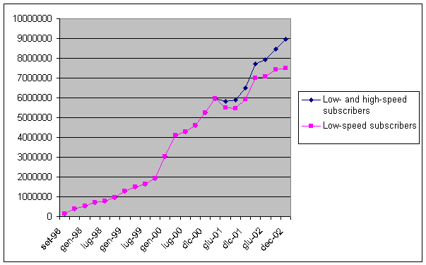 Source: ART, Market Observatory In 2001, low-speed Internet traffic represented approximately 73 billion minutes, growing by about 113% over 2000. The graph below shows a decline in traffic growth beginning the first quarter 2002, possibly caused by the highest consuming subscribers moving to high-speed access.