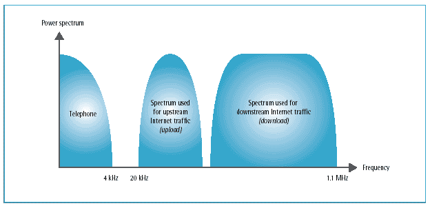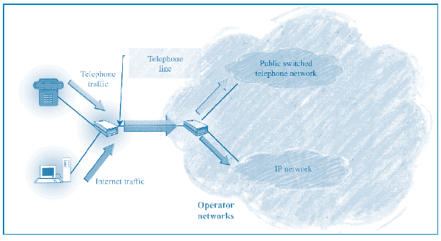 Internet traffic is carried on the copper pair just like telephone traffic, from the user’s computer to a distribution frame, the first element on the switched telephone network. At this point, it is separated from telephone traffic and routed to a separate IP network.