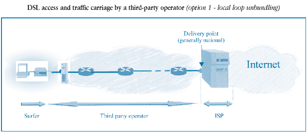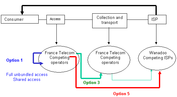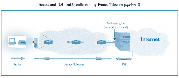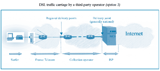 2) (Option 3) Operators buy a DSL traffic collection service on France Telecom’s local loop and resell a global ADSL access and collection service to ISPs. ADSL subscriber traffic is delivered by France Telecom to a carrier at the regional level (40 delivery points). This carrier then extends collection to the ISPs’ servers. ISPs are independent of France Telecom for part of collection allowing them to better distinguish their prices and quality of service (bandwidth per subscriber).