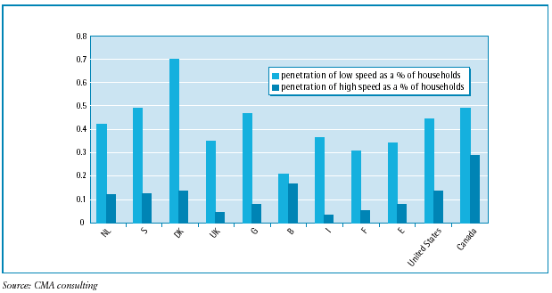 The pricing decisions of July 2002, approved by ART, on IP/ADSL offers for ISPs, had a major impact on price decreases and on the development of competition on this type of access. Moreover, the commercial launch of unbundling in the second half of 2002 is also contributing to the strong growth of ADSL subscriber numbers in France. Cable continues to grow at a steady rate, with Internet-on-cable subscriber numbers at 250 000 at end September 2002, for close to 48% growth in new subscribers in one year. The possibilities for the provision of high-speed Internet access on cable networks are numerous, since over 600 cities in France representing 6 million outlets and over 15 million inhabitants (source AFORM) can use this type of access. In comparison, xDSL technologies have the greatest potential for development on the residential market, because their potential in the short and long term is significantly greater than that of cable networks (we estimate that close to 80% of the population could be connected using an xDSL technology by 2003 in France). The disparities are relatively great in Europe. We can identify three groups of countries in Europe: Scandinavian countries and the Netherlands with a high proportion of households on line, then Germany, the United Kingdom and Belgium, and finally France, Italy and Spain. Position of France in Europe and in the world