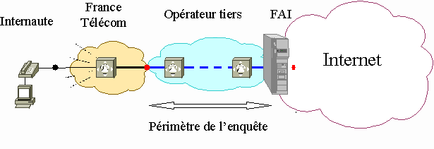 Conformément à la décision de l’Autorité n° 01-898 en date du 5 octobre 2001, une enquête concurrentielle a été engagée au cours de la période de novembre 2001 à février 2002 sur le marché de la collecte Internet à bas débit. Au cours de cette période, les rapporteurs ont rencontré l’ensemble des acteurs opérant de manière significative sur ce marché, en qualité d’offreurs ou de clients. Une quinzaine d’entretiens se sont tenus au total. Cette enquête avait pour objectif de réaliser une évaluation du fonctionnement – fin 2001 – de ce marché par l’analyse des principaux paramètres mesurant le degré et les conditions de concurrence (nombre et typologie des acteurs, parts de marché, existence de barrières à l’entrée, possibilités d’arbitrage entre plusieurs offres concurrentes,…). L’analyse a conduit également a examiner les perspectives de ce marché en 2002 (cf. partie III.). Le présent rapport a pour objet d’exposer de manière exhaustive l’analyse tirée de l’enquête et d’en restituer les principales conclusions en terme de régulation. I.1. Définition du marché considéré L’enquête a porté exclusivement sur le marché de la collecte de trafic Internet commuté ou bas débit, segment considéré comme pertinent pour les raisons suivantes : - l’accès à Internet à bas débit se distingue de l’accès à Internet à haut débit – lequel peut d’ailleurs lui-même couvrir plusieurs segments de marché distincts : par la nature même des offres, le niveau des prix et les usages, les services rendus sur ces deux marchés ne sont pas substituables ; - le marché de la collecte Internet se distingue du marché final de l’accès à Internet, par la qualité des offreurs et intervenants sur ces deux marchés ; le marché en cause est en effet un marché intermédiaire, sur lequel les clients sont les fournisseurs d’accès à Internet (FAI) et les offreurs des opérateurs de télécommunications ; - dans le cas général, l’opérateur prend livraison de son trafic au niveau de son point de raccordement au réseau de France Télécom par le biais de l’offre d’interconnexion indirecte figurant au catalogue d’interconnexion ; cette prestation, fournie dans le cadre de l’interconnexion, et qui fait l’objet d’une analyse particulière dans le cadre de l’enquête relative à l’interconnexion, est en principe à distinguer de la collecte de trafic Internet, fournie par les opérateurs (dont France Télécom) et qui consiste en l’acheminement du trafic jusqu’au point de présence du FAI. Le marché de la collecte peut ainsi être défini comme la rencontre entre l’offre des opérateurs disposant d’un réseau IP interconnecté au réseau de France Télécom et capables de collecter le trafic des internautes et la demande des fournisseurs d’accès à Internet souhaitant rendre accessibles leurs services aux internautes. Ce sont ainsi les FAI qui sont considérés comme les consommateurs sur ce marché ; les clients finals internautes n’ont en effet pas de relation directe avec le transporteur ou collecteur de trafic. Schématiquement, le périmètre de l’enquête se présente ainsi de la manière suivante :