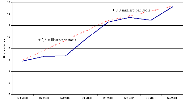 de trafic internet commuté Avec l’IFI, il peut être également pertinent de valoriser le marché en nombre de portes. .La conversion du volume de minutes dépend du remplissage des portes qui est un paramètre propre à chaque FAI en fonction de la qualité de service voulue par le FAI. Si on considère un remplissage de 14 000 minutes par mois par porte(1), le marché représente 360 000 portes fin 2001. En 2001, le trafic Internet a crû de 87,2 %. La courbe montre une tendance à une diminution de la croissance du trafic internet à compter du deuxième trimestre 2001. Ce ralentissement de croissance combiné à une forte baisse des prix a pu donner lieu à une baisse du chiffre d’affaires mensuel sur la fin de l’année 2001. La croissance en 2002 risque d’être moins importante. En effet, la migration des abonnés vers l’ADSL ne sera pas forcément compensée par de nouveaux abonnés, d’autant que les abonnés migrant vers l’ADSL devraient logiquement être les consommateurs les plus importants. . En valeur Si l’on considère un prix moyen à la minute fin 2001 de 1,1 centimes d’€ et un volume mensuel de 5,1 milliards de minutes, la collecte de trafic représente un chiffre d’affaires mensuel de 56 millions €.