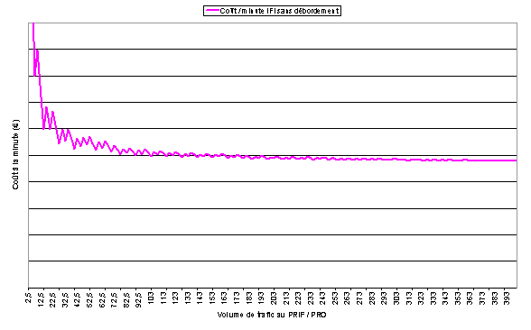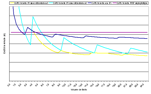 L’IFI a représenté un bouleversement des règles du jeu globalement mal perçu par les opérateurs. Si l’offre 2001 était jugée extrêmement favorable par tous les opérateurs à cause du débordement, l’offre 2002 est perçue de manière négative par certains à cause de la suppression du débordement, et comme un bon compromis par d’autres. L’IFI a entraîné une baisse des prix dès juin 2001. Les prix planchers semblent ainsi avoir atteint le niveau PRO minute. Les opérateurs ne s’engageant pas dans l’IFI paraissent voués à être exclu du marché de la collecte Internet. L’IFI représente des économies d’autant plus importantes que le volume de trafic est important (cf. analyse ci-après). Certains opérateurs considèrent donc que l’IFI est un dispositif " élitiste " qui risque de ne laisser survivre que les plus gros collecteurs, à commencer par France Télécom. Estimation de l’effet de volume de l’IFI L’IFI a un fort effet volume qui risque d’accélérer la sortie du marché des " petits " collecteurs, faute de pouvoir rester compétitifs avec les " gros " opérateurs (au premier rang desquels France Télécom). Les graphiques suivants permettent d’illustrer cet effet. PRIF