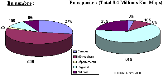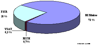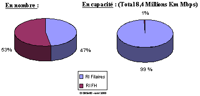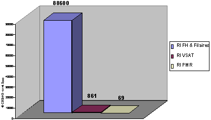 Les réseaux VSAT, ainsi que les réseaux à faisceaux hertziens –plus nombreux que les 50 réseaux filaires traités– restent marginaux en poids économique (respectivement 36MF et 84MF), les derniers représentant moins du pourcentage des réseaux filaires en capacité de transmission estimée à plus de 8 millions de Km Mbps.