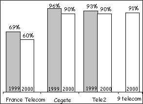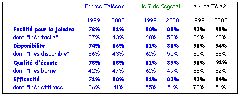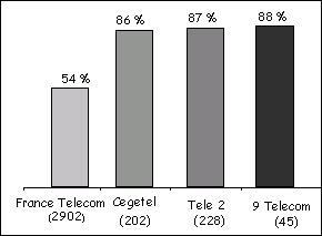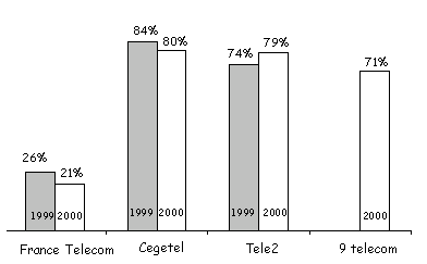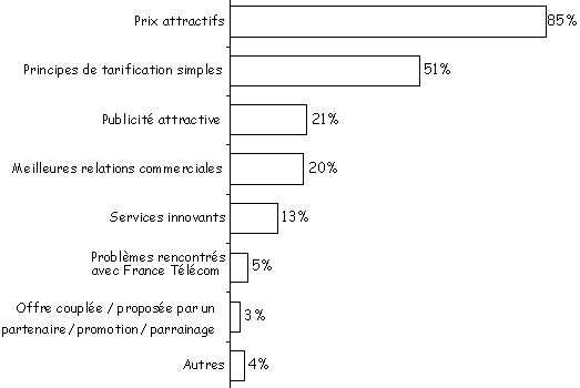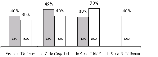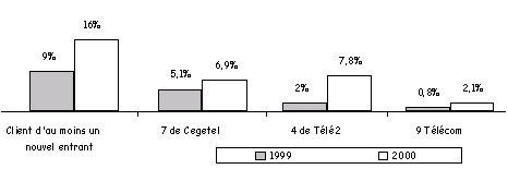 On relève notamment la forte percée du 4 de Télé 2 avec 7,8% de pénétration (contre seulement 2% l'an dernier), devançant le 7 de Cegetel. Le 7 a progressé également mais dans une moindre mesure : 6.9% de parts de marché en 2000 contre 5.1% l'an dernier. On constate également une progression de la représentativité de 9 Télécom : 2.1% contre 0,8% l'an dernier. L'ancienneté de la relation avec le nouvel entrant est logiquement liée à leur date d’entrée sur le marché : 50% des abonnements à Cegetel, premier concurrent à être entré sur le marché, ont été souscrits il y a un an et plus, alors que 43% des abonnements à Télé 2 et 40% des abonnements à 9 Télécom ont été souscrits dans les six derniers mois. Motifs du changement d’opérateur