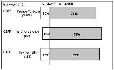 (1)Ces valeurs sont calculées sur la base d’une durée moyenne de communication pour chaque type d’appel (local et longue distance) et d’une pondération entre les appels acheminés aux heures pleines (tarif normal) et aux heures creuses (tarif réduit). Ne sont pas pris en compte dans ce calcul les options tarifaires et les forfaits. (2)Tous les tarifs donnés sont en heures pleines au delà du crédit temps en francs toutes taxes comprises. (3)Source : le 1014 de France Télécom (4)Source : http://www.budgetelecom.com (5)Moyenne arithmétique calculée à partir des prix de tous les opérateurs existants et avant le 1er novembre 2000. En revanche, pour ceux qui ont une idée des prix pratiqués en téléphonie, la perception du prix de la minute de téléphone sur le fixe est en sensible diminution par rapport à 1999. Les foyers abonnés à la facturation détaillée sur le fixe (56% des foyers) sont un peu plus nombreux que les autres à avoir une idée des prix pratiqués, même si les taux de "sans réponse" auprès de cette population demeurent très élevés. On constate par ailleurs une baisse sensible sur 1 an de la facture moyenne de téléphone avec France Télécom : elle passe de 475,70 francs en 1999 à 417,70 francs en 2000. Cette diminution peut être imputée à plusieurs facteurs : la baisse des tarifs, la progression des nouveaux opérateurs sur le marché de la longue distance et la percée des mobiles qui influent sur le trafic de la téléphonie fixe. 2-2- La lecture et la connaissance des conditions contractuelles. Le taux de lecture des contrats est toujours très différent entre l’opérateur historique et les autres : 21% pour France Télécom contre 77% en moyenne pour les nouveaux entrants. Pour France Télécom, ce taux de lecture est difficile à analyser compte-tenu de l’ancienneté de la relation avec l’opérateur historique : en effet, plus de 40% des clients ne se souviennent plus s’il ont lu ou non leur contrat France Télécom. Or France Télécom a adressé un exemplaire de ses conditions générales de vente à l’ensemble de ses clients avec la facture de janvier 1999. Tous les clients de France Télécom, anciens ou nouveaux, ont donc eu récemment un exemplaire de ce document. Le taux de lecture des contrats sur le fixe