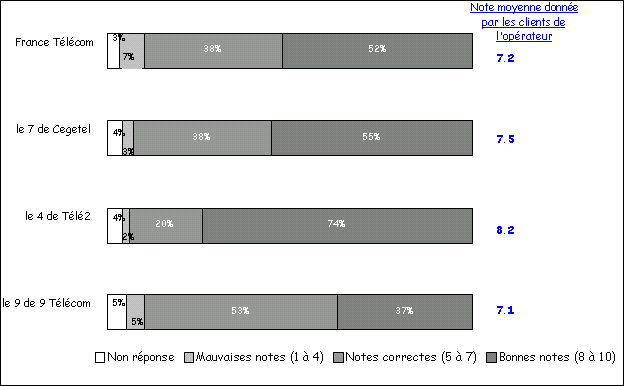 Les taux de problèmes techniques et de facturation rencontrés avec les nouveaux opérateurs sont homogènes et légèrement supérieurs à ceux constatés par les clients de France Télécom. 2-5- L’image des opérateurs de téléphonie fixe Les notes moyennes données aux différents opérateurs par leurs clients sont bonnes, toutes comprises entre 7 et 8. Le 4 de Télé 2 reçoit la meilleure note (8,2) : 74% des foyers qui en sont clients lui attribuent une bonne note (comprise entre 8 et 10). Les autres opérateurs, France Télécom, Cegetel et 9 Télécom, sont perçus de façon assez similaire. L'image des opérateurs du fixe