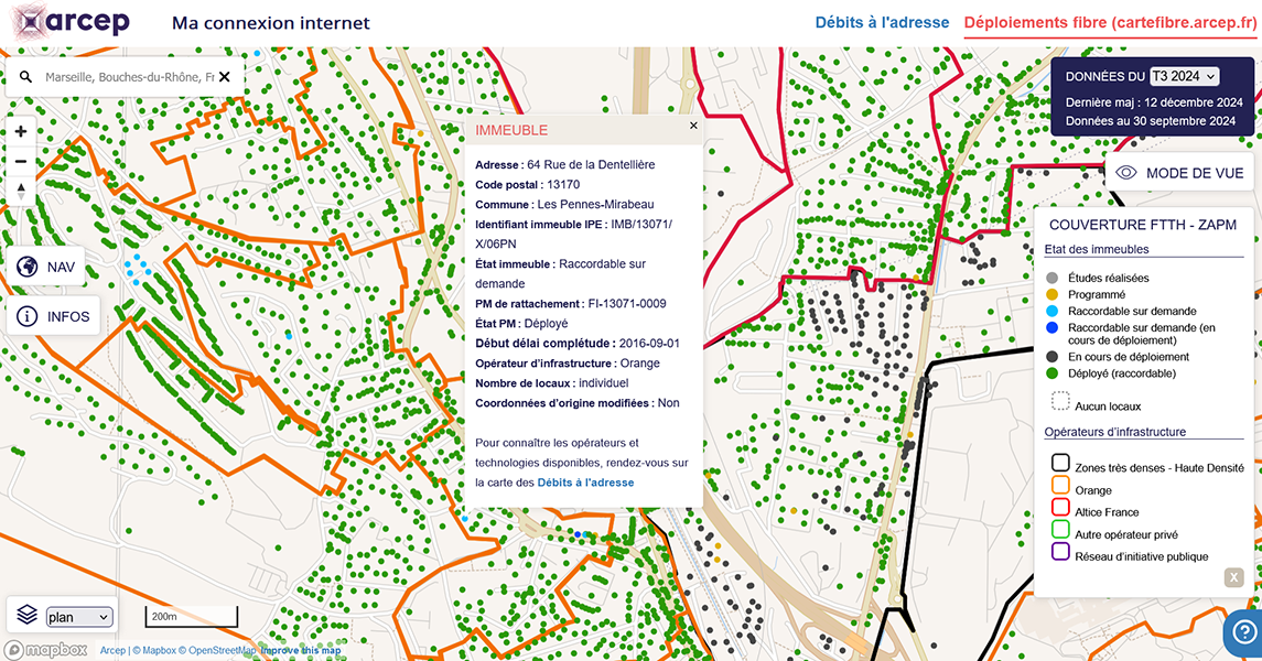 The “Déploiements fibre” maps on the “Ma connexion Internet” website (formerly cartefibre.arcep.fr) allow users to track the progress of FttH rollouts in a very detailed fashion.