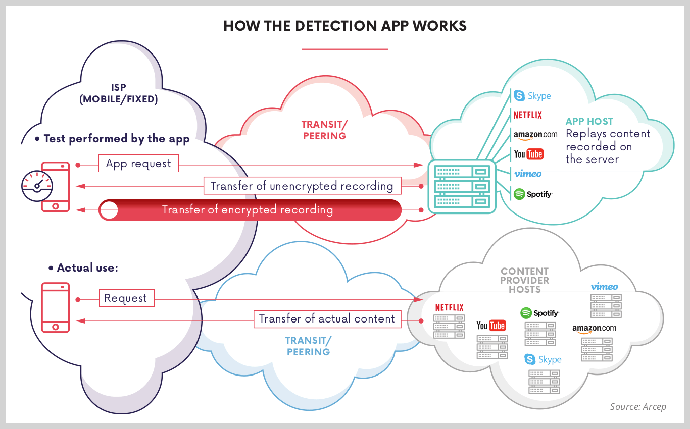 From a technical standpoint, the Wehe app records traffic to see if an operator is throttling or prioritising the traffic generated by any services. The test takes place in two stages. Wehe simulates use of the service so that an operator will treat the traffic the way it would treat real traffic coming from that service. Wehe then replays the same traffic by replacing the identified content (name of the app and servers used, etc.) with randomised bytes, which prevents the operator from identifying the traffic as coming from a specific service. Next, Wehe compares the throughput recorded during those two runs, and repeats the test to rule out the impact of bad network conditions as much as possible, to then establish whether traffic differentiation has occurred. If it proves to be the case, Wehe gives the option of running additional tests to see whether Deep Packet Inspection (DPI) rules are in place, which the operator may have installed to detect the traffic streams to be throttled or prioritised.