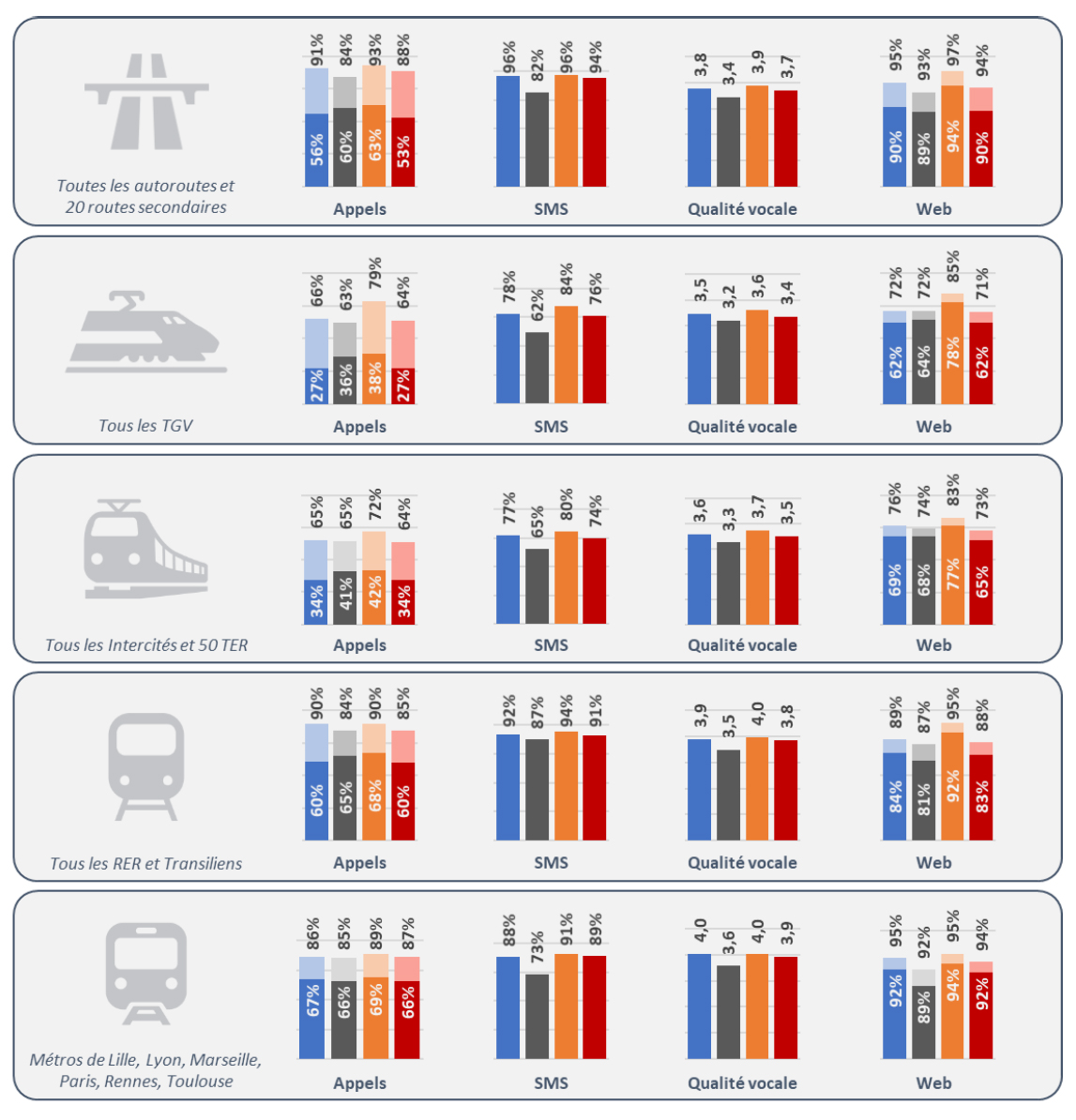 Calls: the success rate for calls maintained for two minutes and of calls maintained for two minutes without audible disturbance. On modes of transport, calls are made between two SIM cards belonging to the same operator (on-net calls). In living environments, calls are made using every SIM card combination (on-net and off-net).