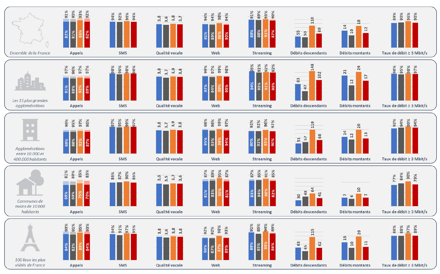 There are significant disparities in quality levels depending on the location and the operator: Arcep invites everyone to compare the findings using the “Mon réseau mobile” tool, each according to the type of area where they live (high-density, medium-density or rural) and the type of transport they use.