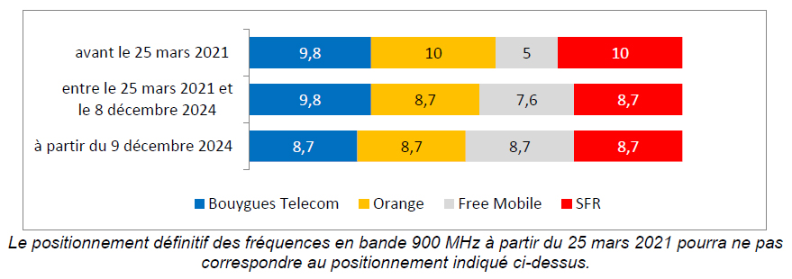 - 900 MHz band: Bouygues Telecom, Free Mobile, Orange and SFR will each be allocated a 8.7 MHz duplex starting in December 2024. The final positions of 900 MHz band frequencies have not yet been set. Arcep will consult with the winning candidates before making its decision, which will be the subject of a future publication.